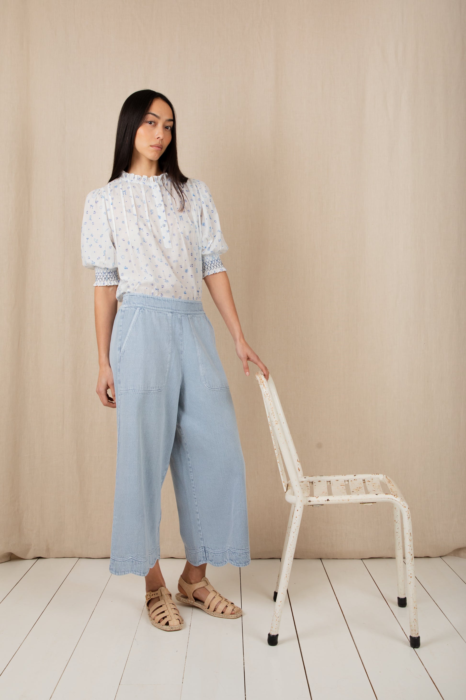 Loose + relaxed fitting, 3/4 length, wide leg, pull on organic cotton twill, trouser, garment dyed, with an elasticated back and a feminine scallop hem detail.