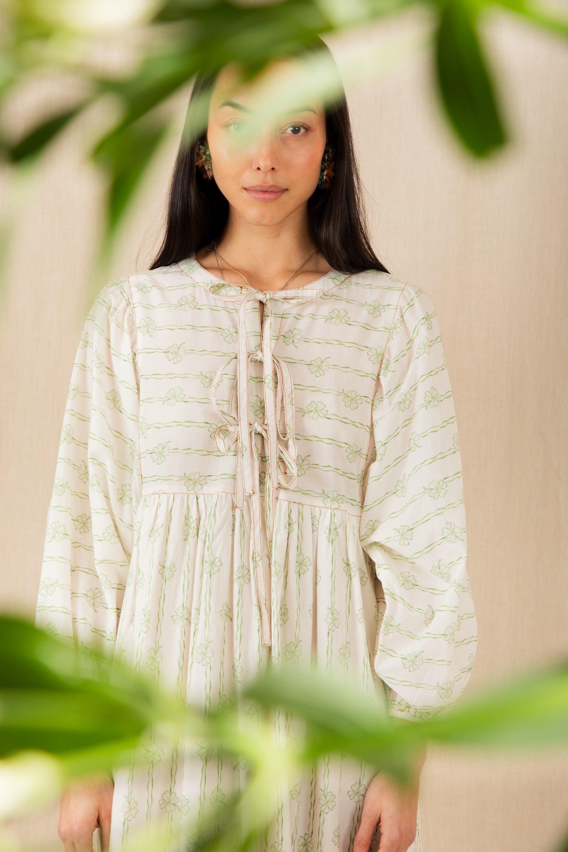A loose and relaxed, easy-fit organic cotton cambric printed dress, body lined, with a statement bow fastening detail and an empire line. Contrast tan coloured topstitching.