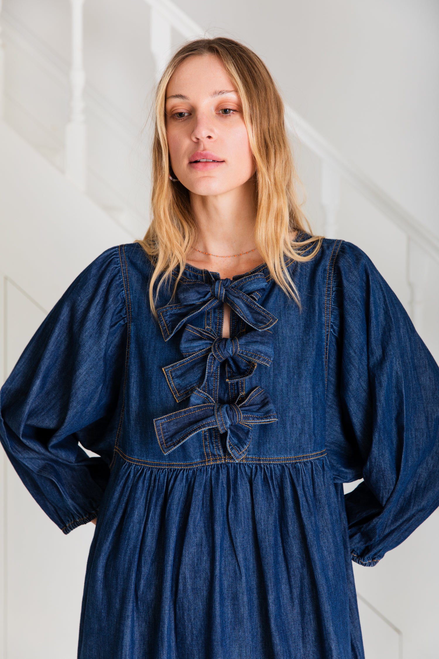 A loose and relaxed easy-fit organic cotton denim dress, in a dark wash, with a statement bow fastening detail and an empire line. Contrast tan coloured topstitching.