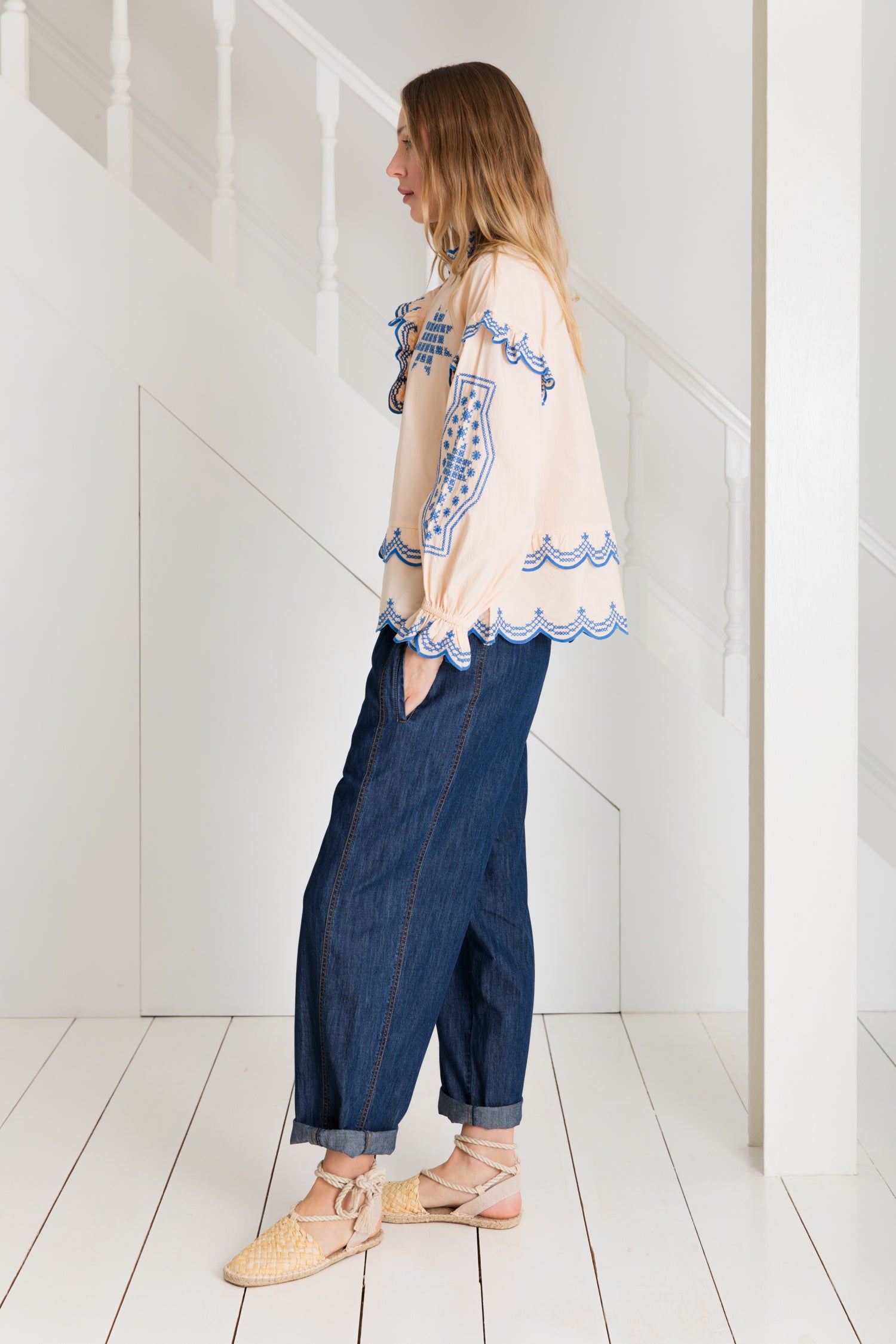 A relaxed and loose-fitting smock style top in organic cotton with detailed cross-stitch embroidery.