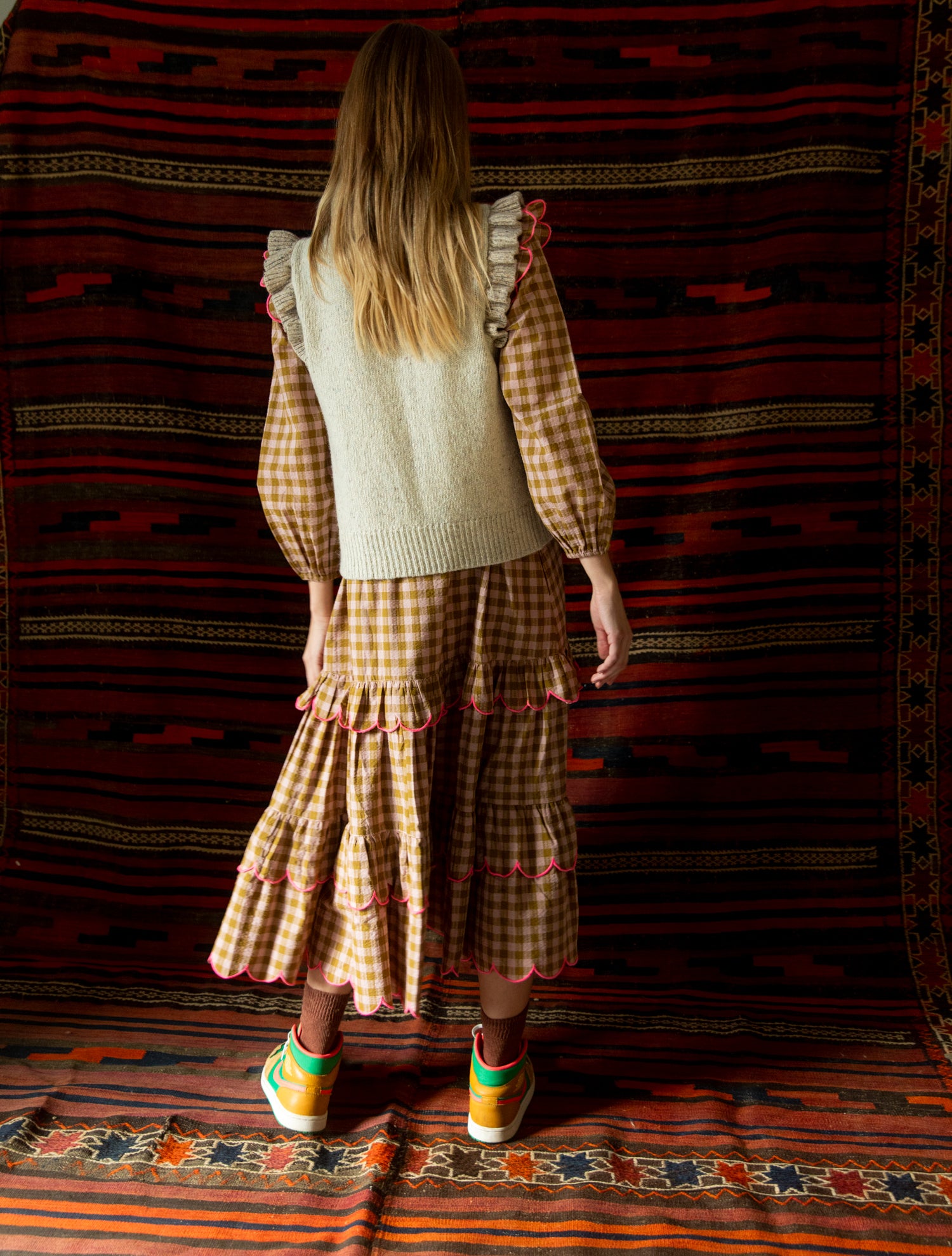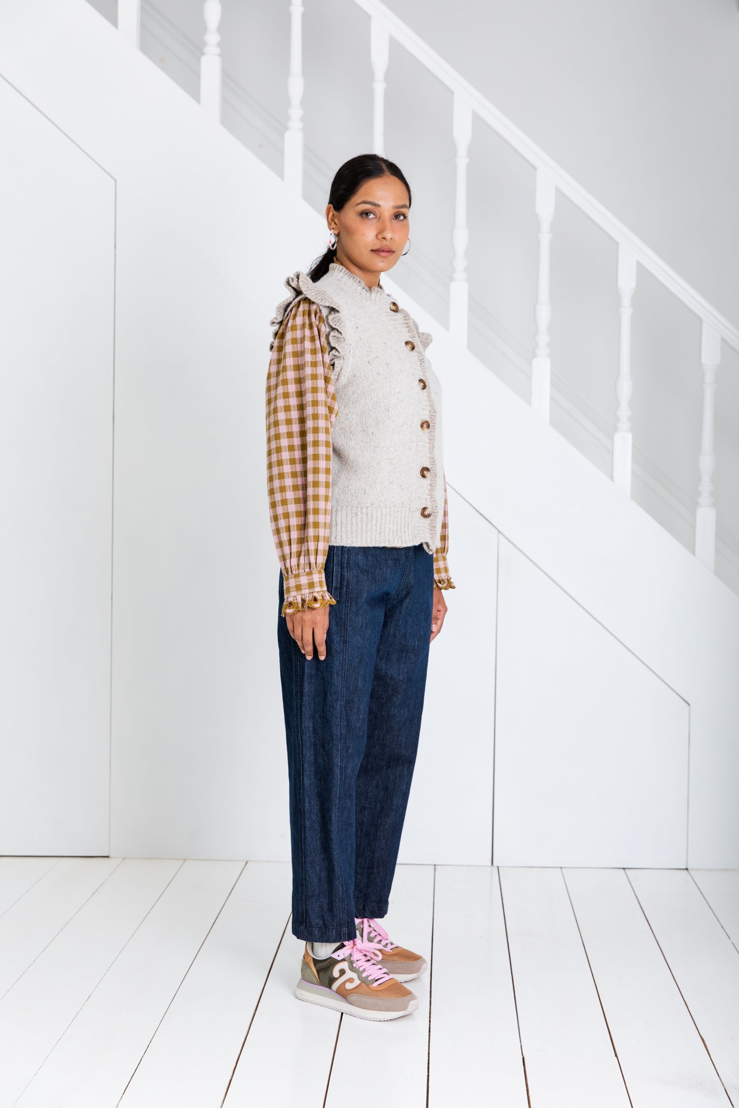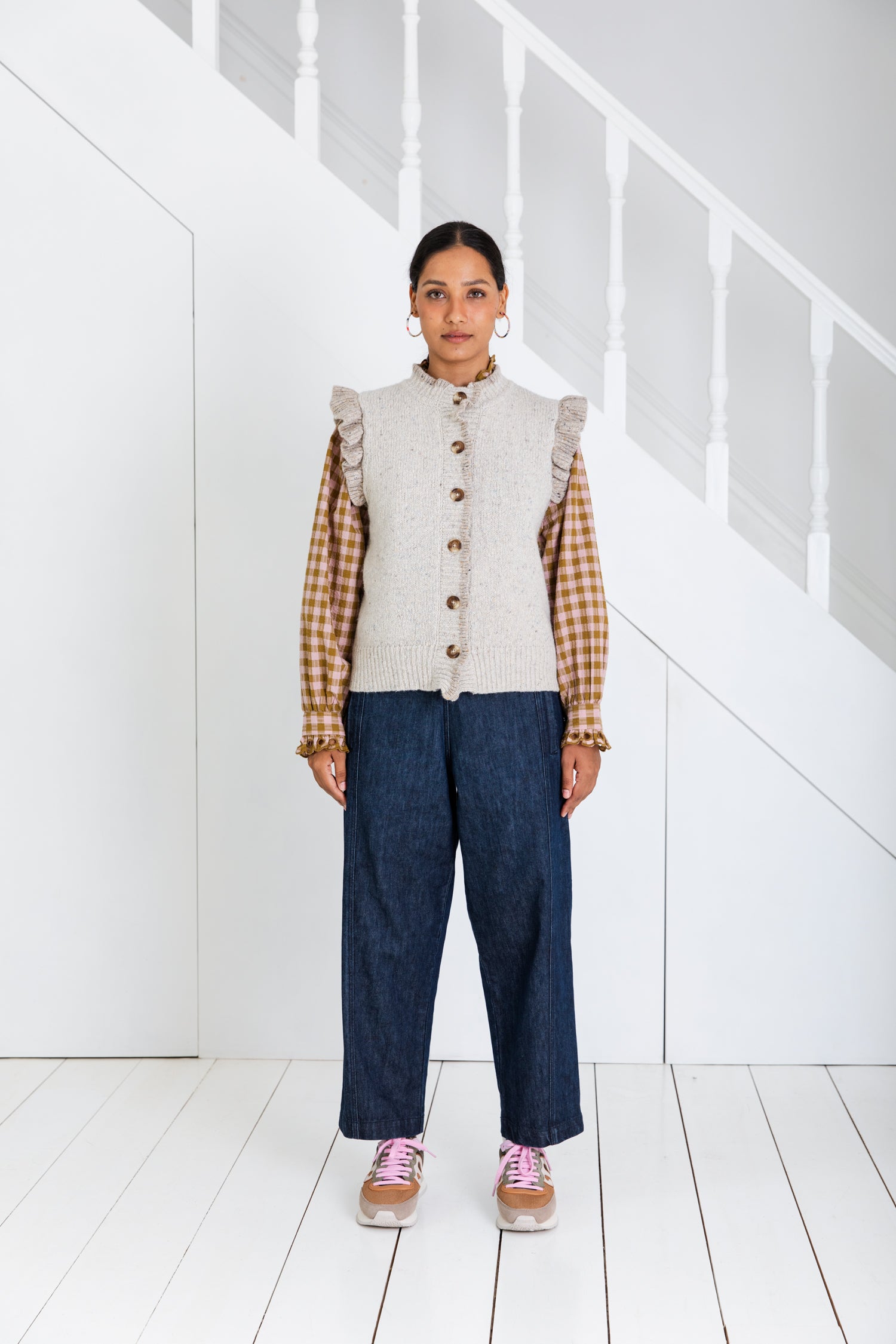 A perfect transitional layering Gillet in a soft + cosy yarn, layers perfectly over almost anything, adding an eclectic vintage charm. Featuring a high neck, with a gently gathered frill edge with contrast colour tipping at the neck + centre front, with large mock-horn buttons. The armhole adds a feminine touch with a tonal frill detail.