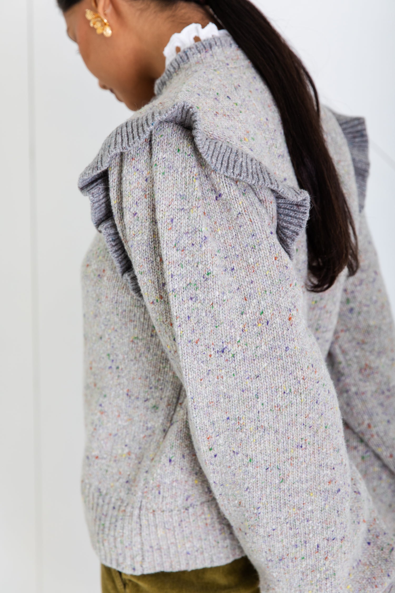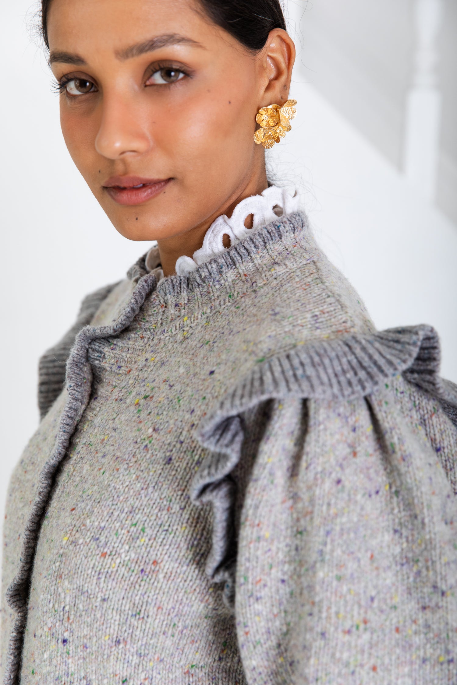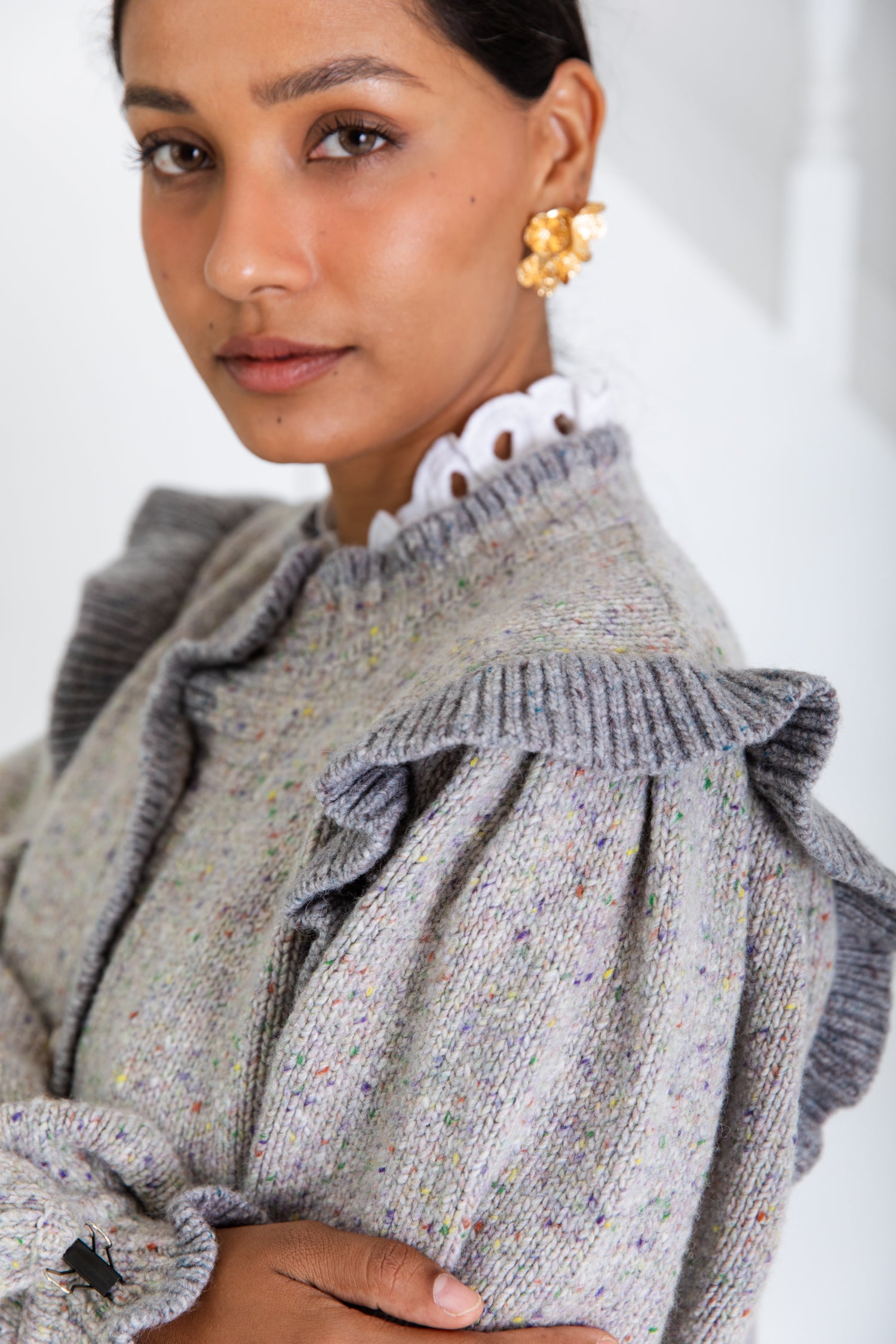 A perfect transitional layering knit jacket a soft + cosy yarn, layers perfectly over almost anything, adding an eclectic vintage charm. Featuring a high neck, with a gently gathered frill edge with contrast colour tipping at the neck + centre front, with large mock-horn buttons. The sleeve is voluminous and features a feminine frill at the armhole in a tonal contrast colour. The cuff is ribbed with a delicate contrast tipped frill edge.