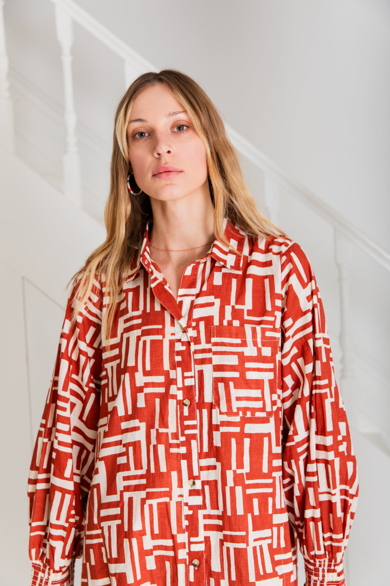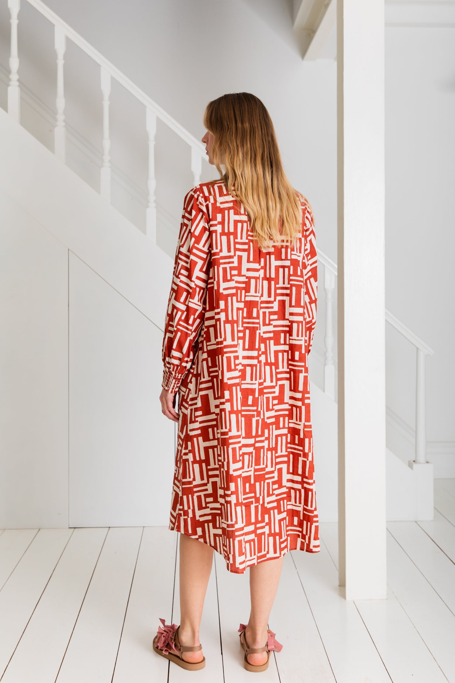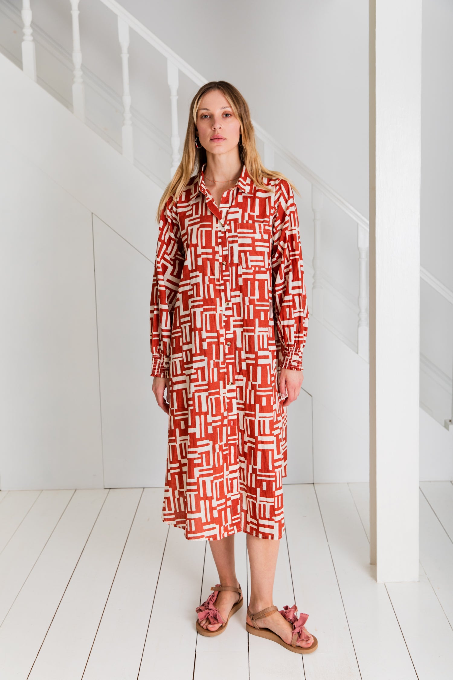 A loose fitting, calf-length, A-line style shirt dress in organic cotton cambric.