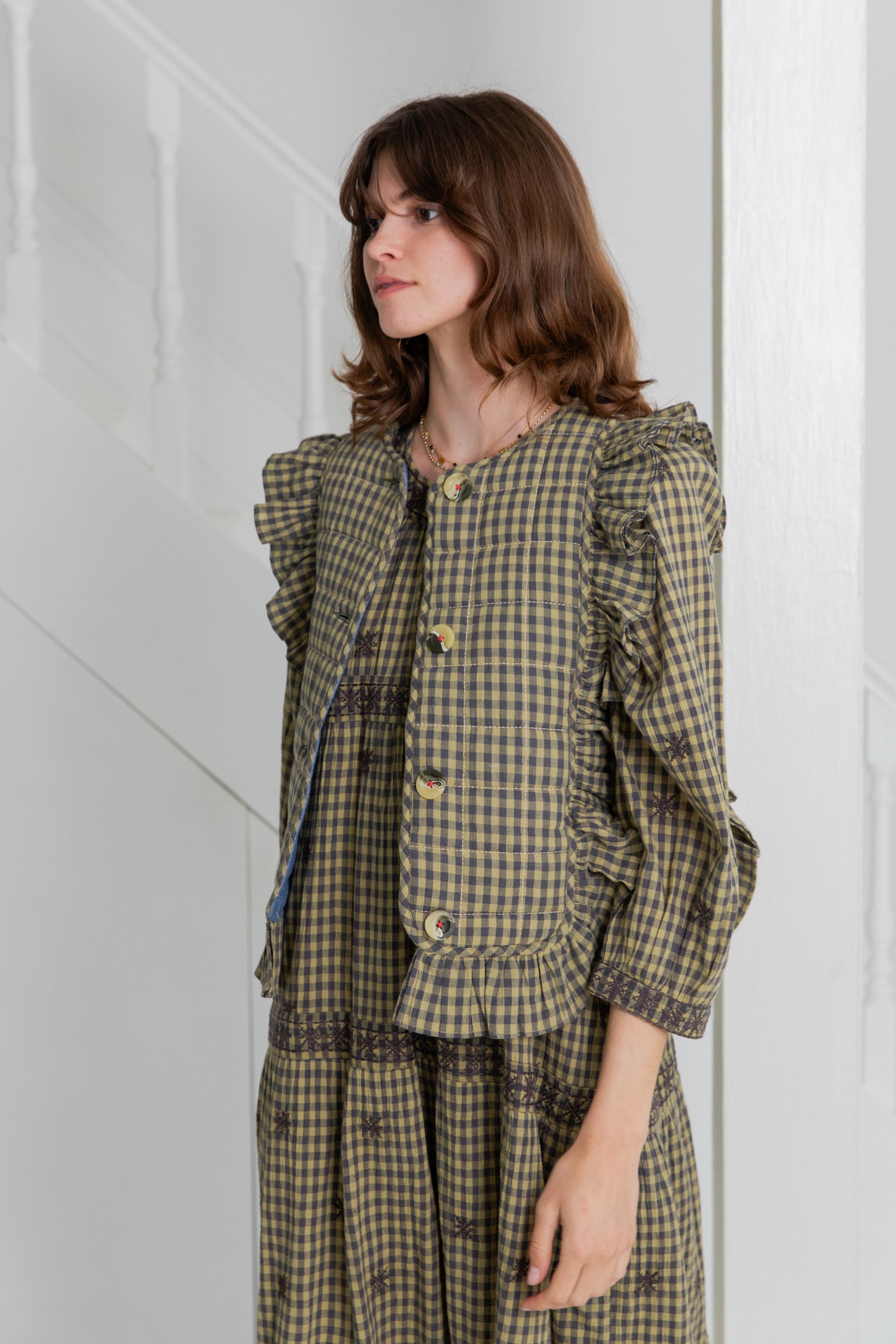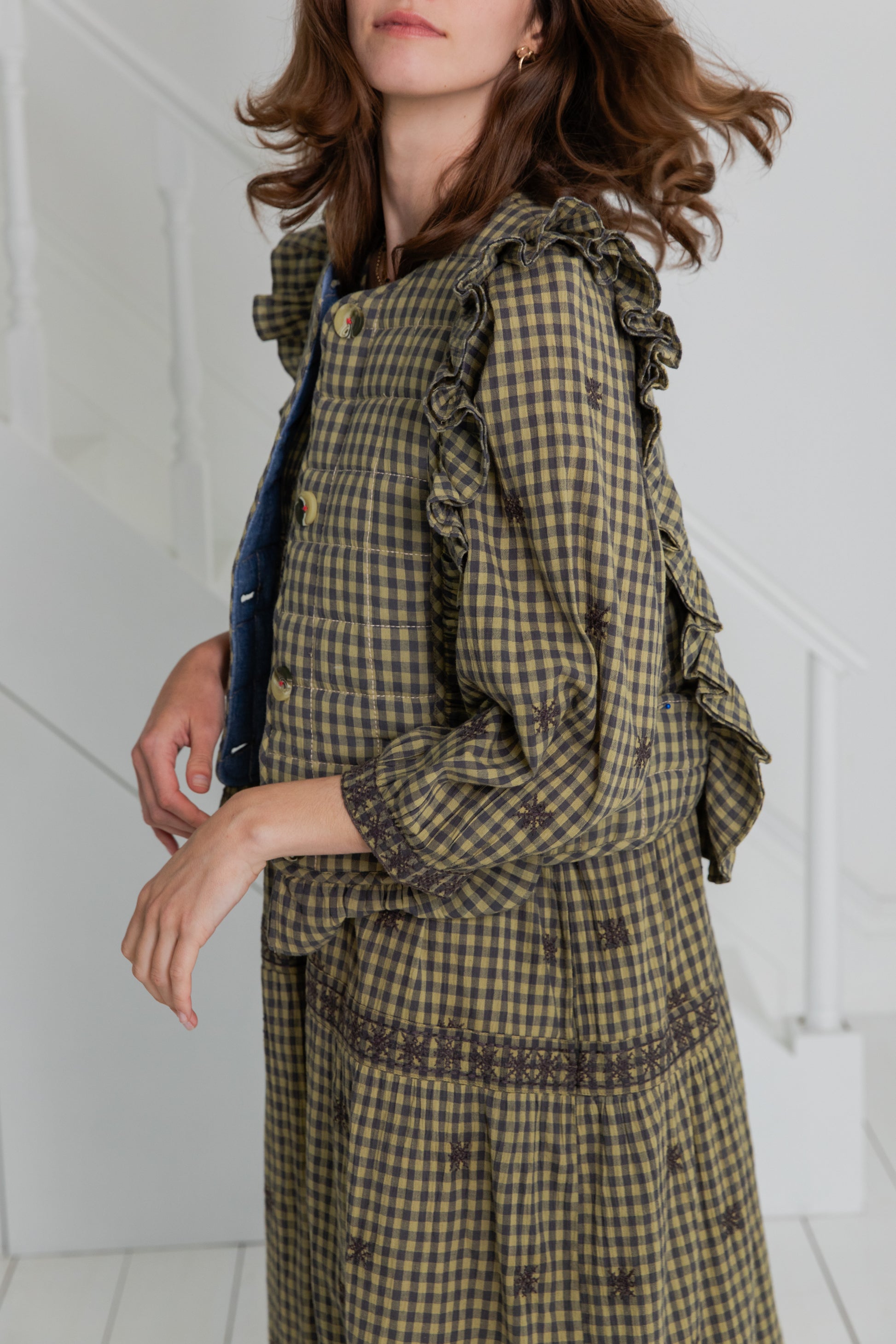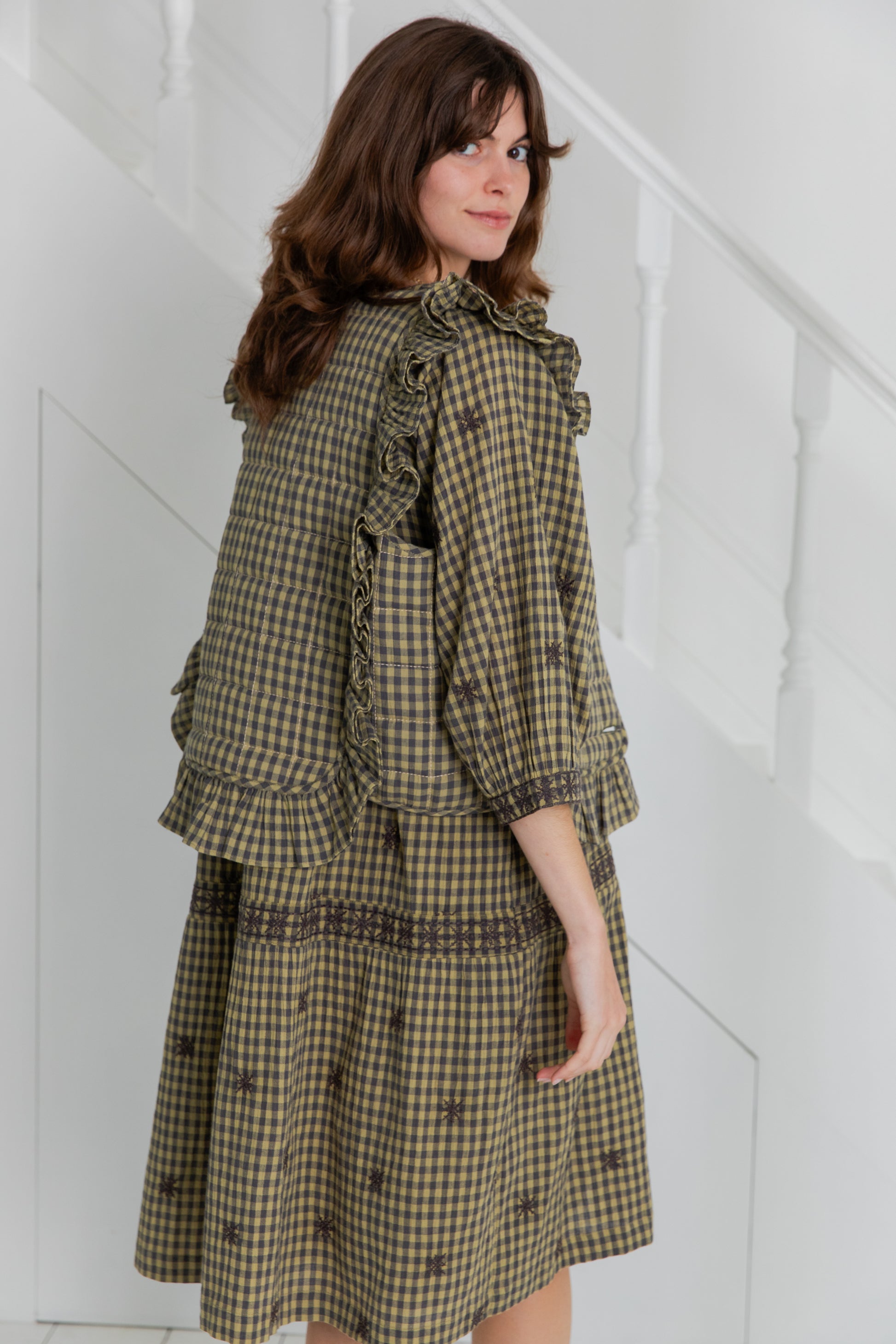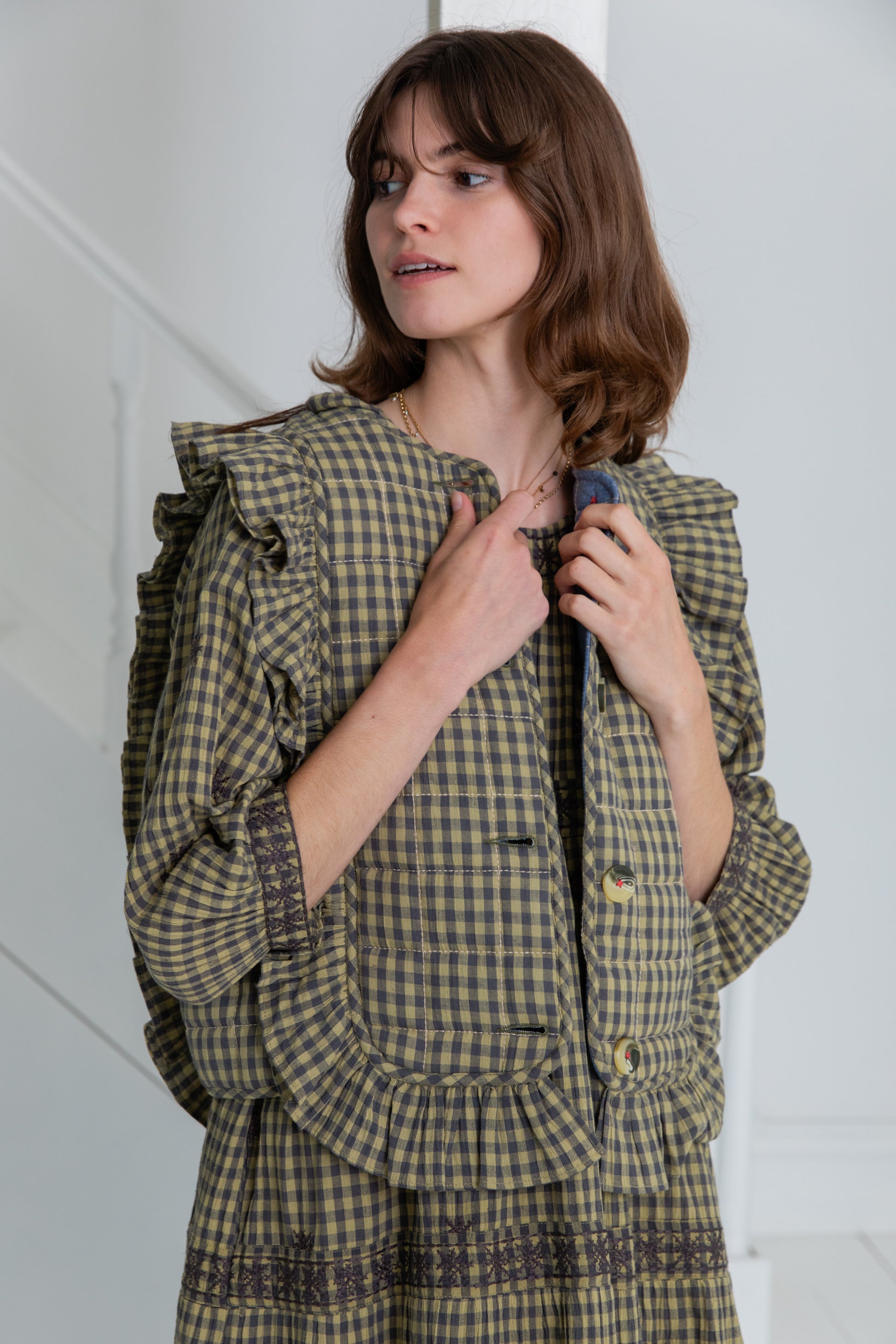 A beautiful statement quilted gilet like no other, with a poetic frill detail on the front and back in an organic cotton gingham with a contrast chambray lining. There are buttons at the front and this unique piece works equally well with tops and dresses.