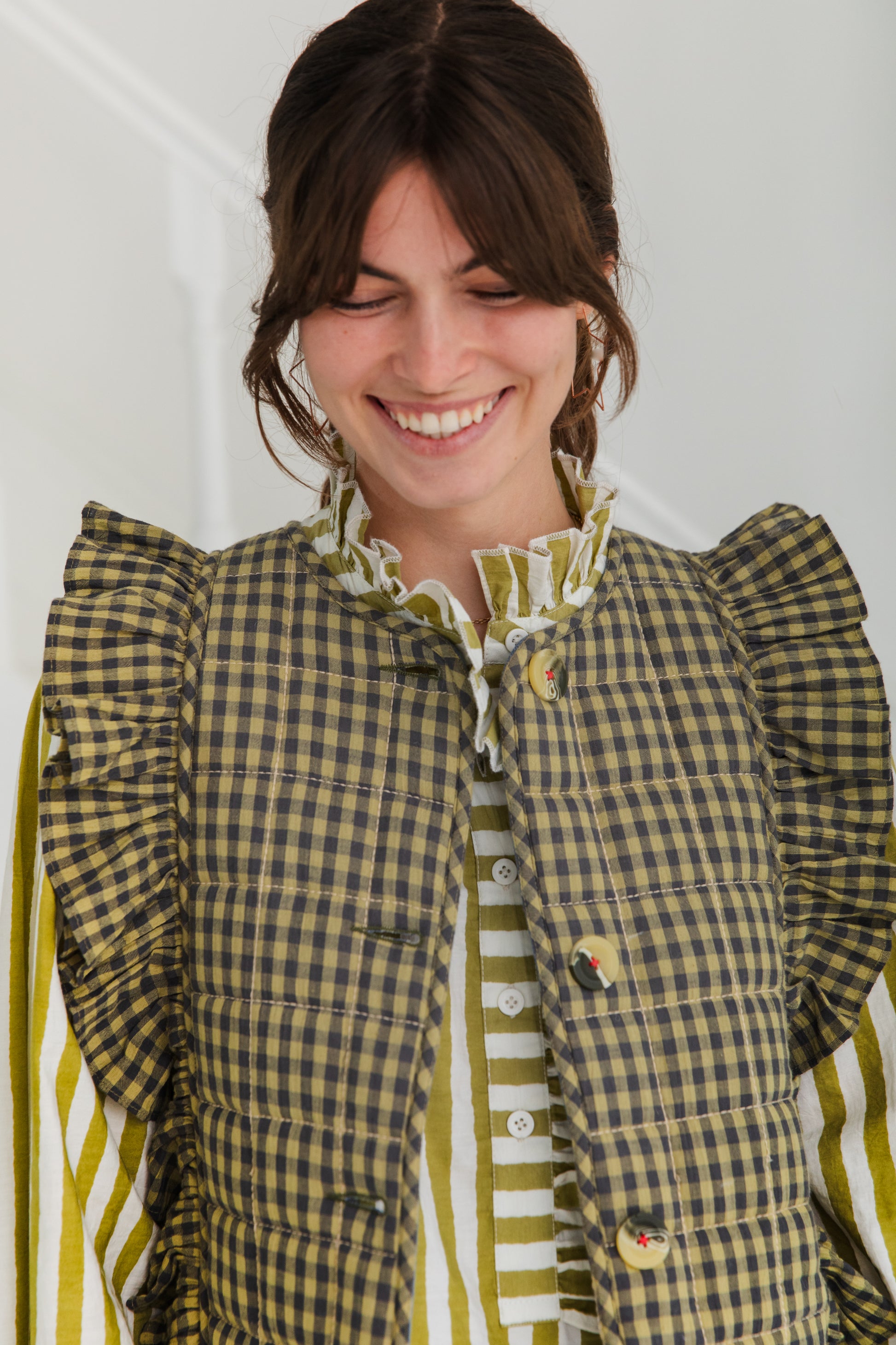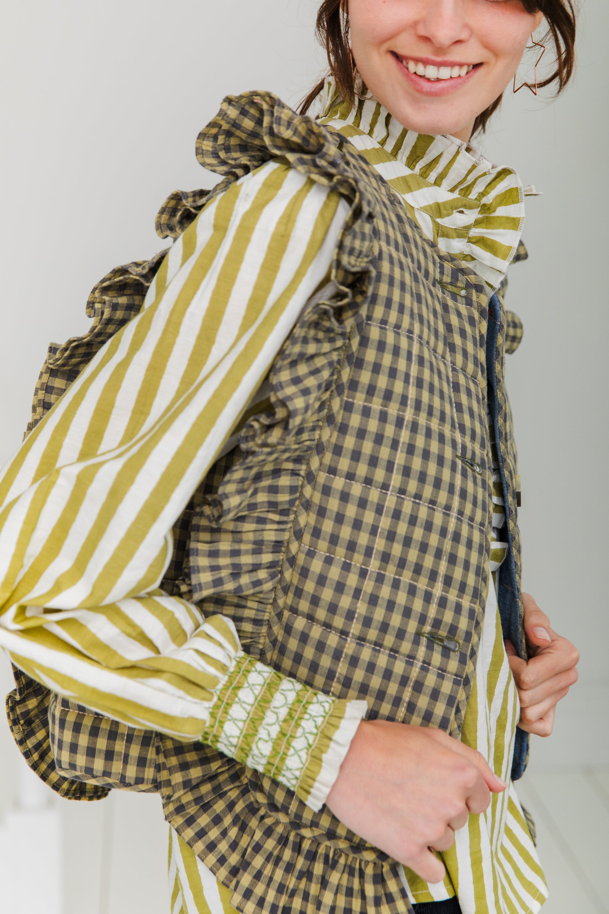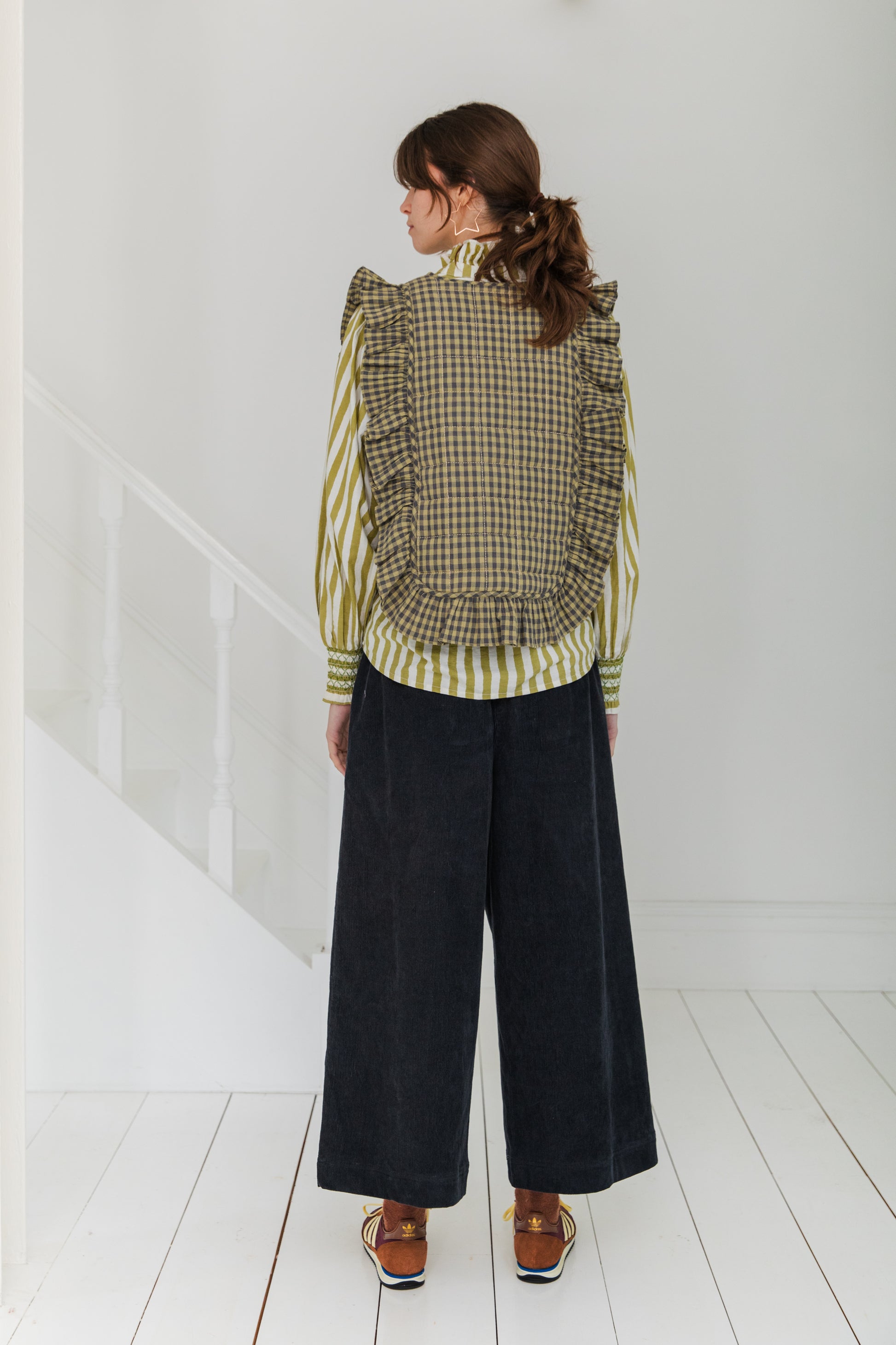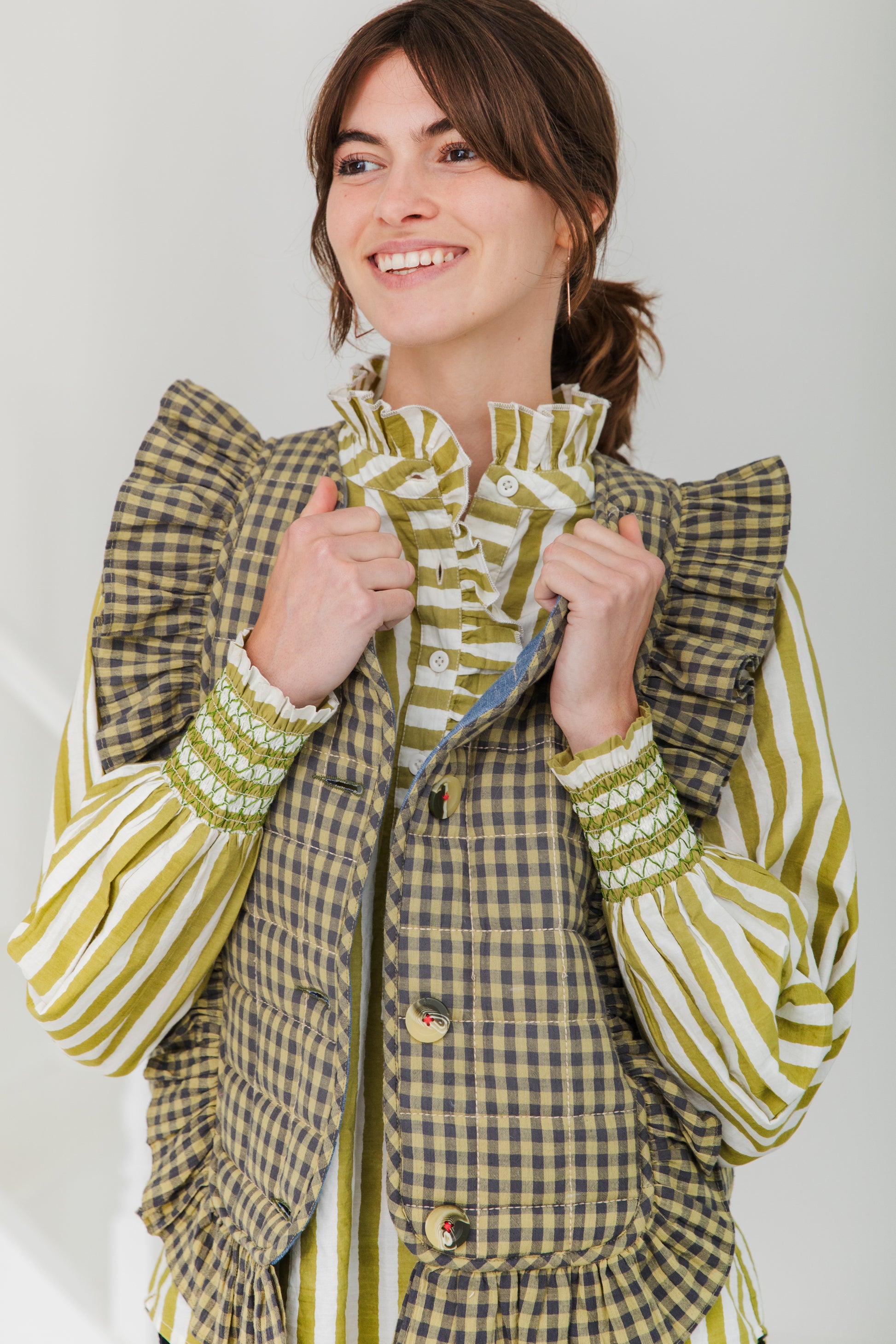 A beautiful statement quilted gilet like no other, with a poetic frill detail on the front and back in an organic cotton gingham with a contrast chambray lining. There are buttons at the front and this unique piece works equally well with tops and dresses.