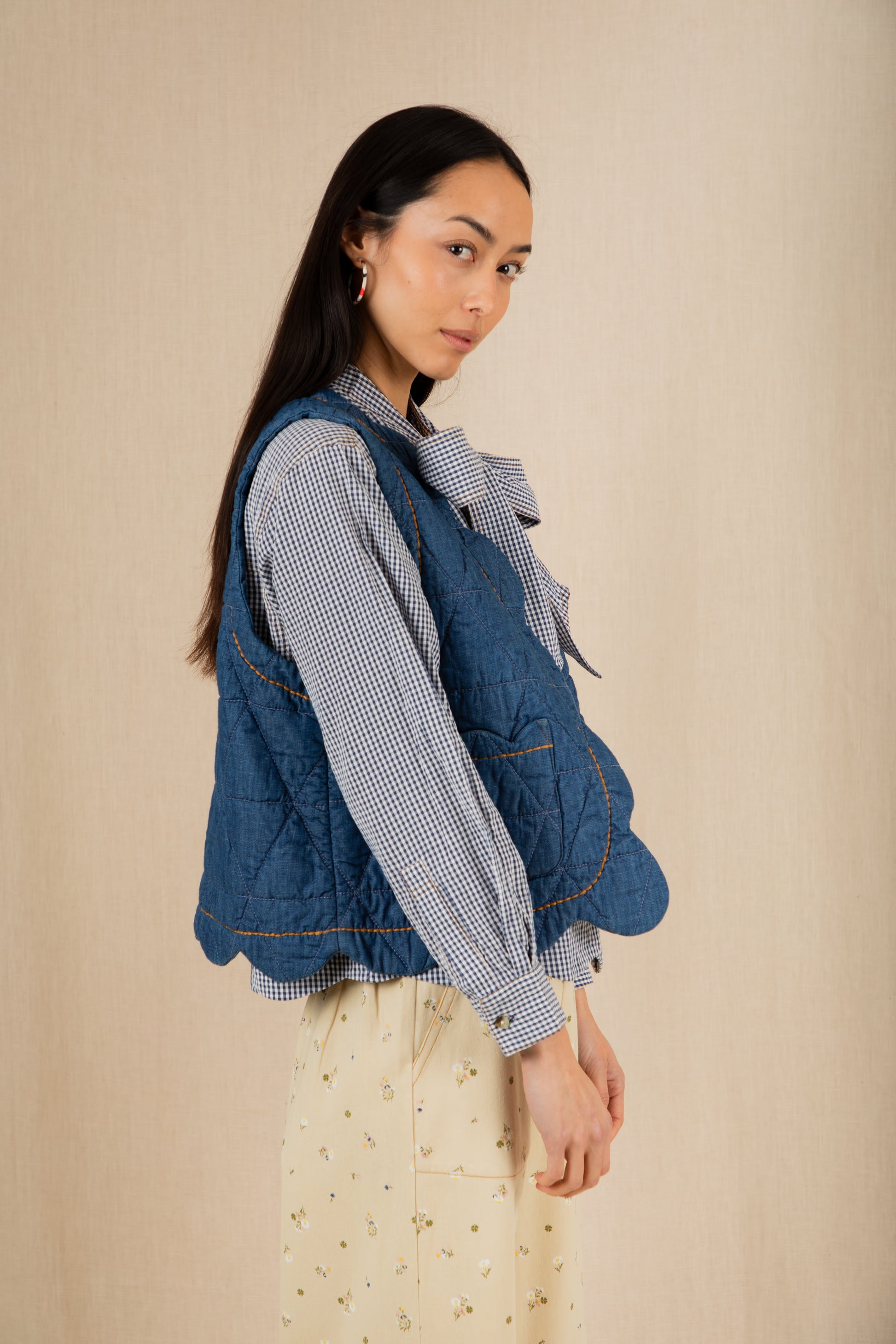 A beautiful + individual, quilted Gillet in an organic cotton denim in a mid wash, with a unique scallop edge detail.