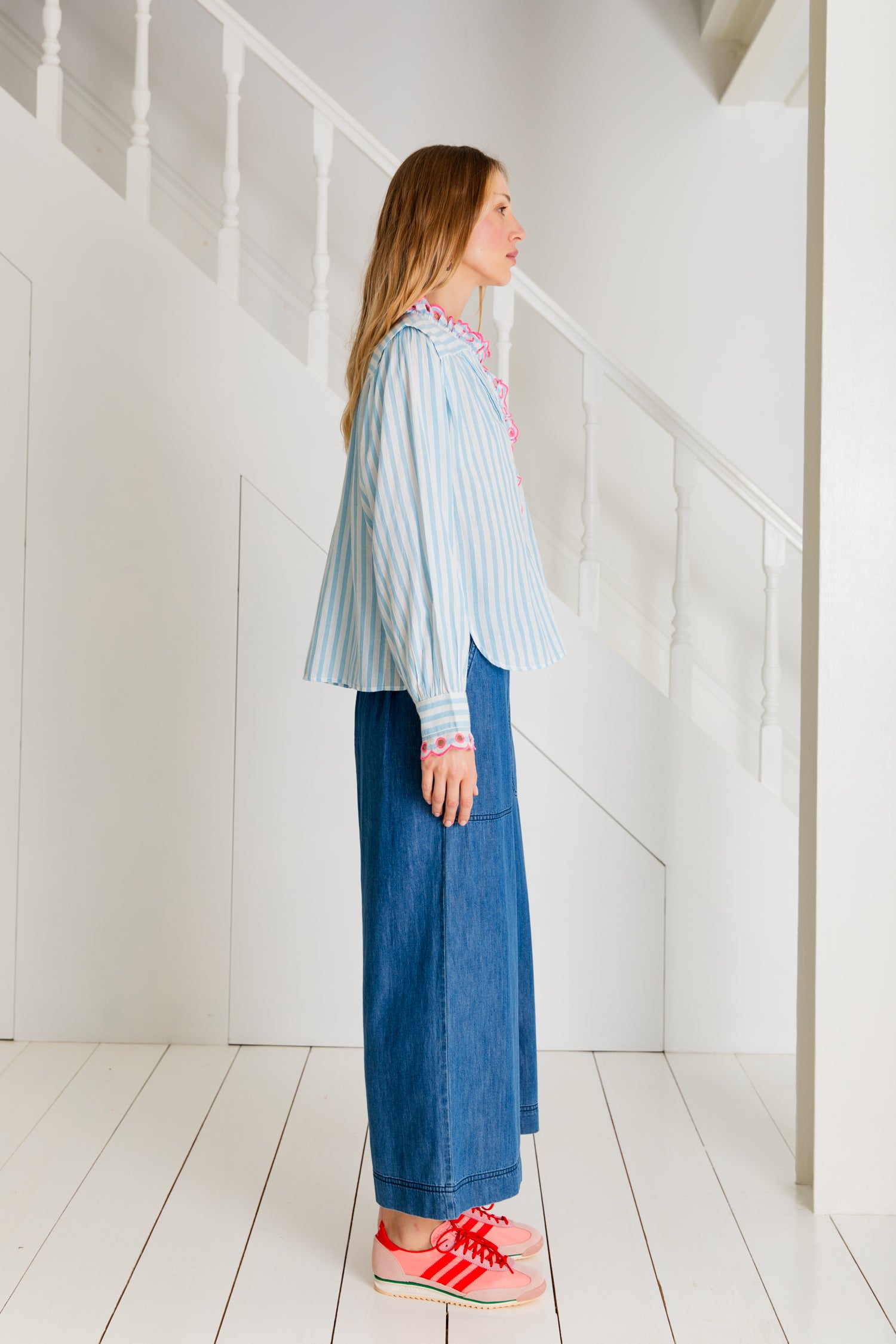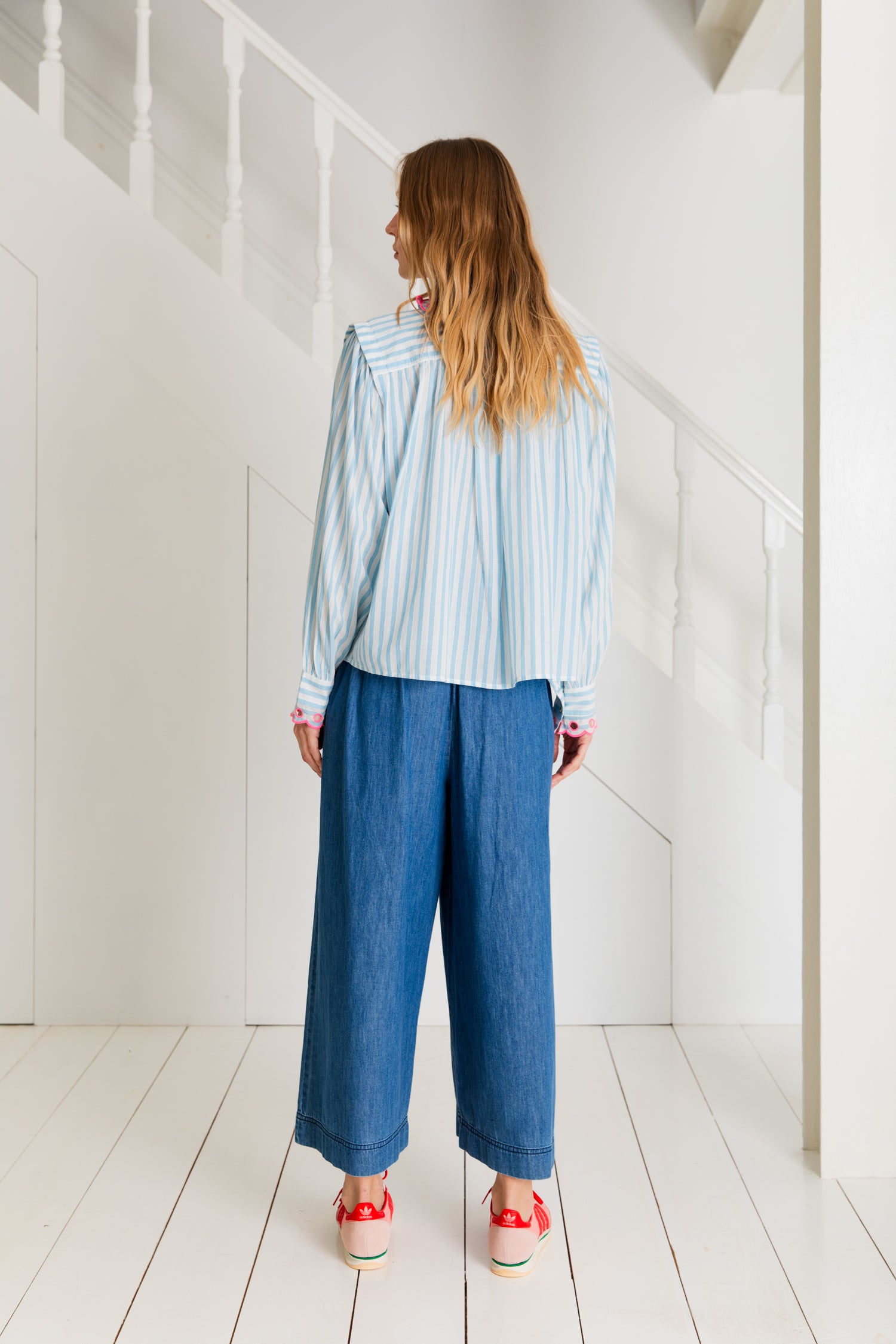 A relaxed + easy shirt in yarn-dyed stripe organic cotton, with detailed eyelet embroidery in neon on the collar, placket and cuffs.