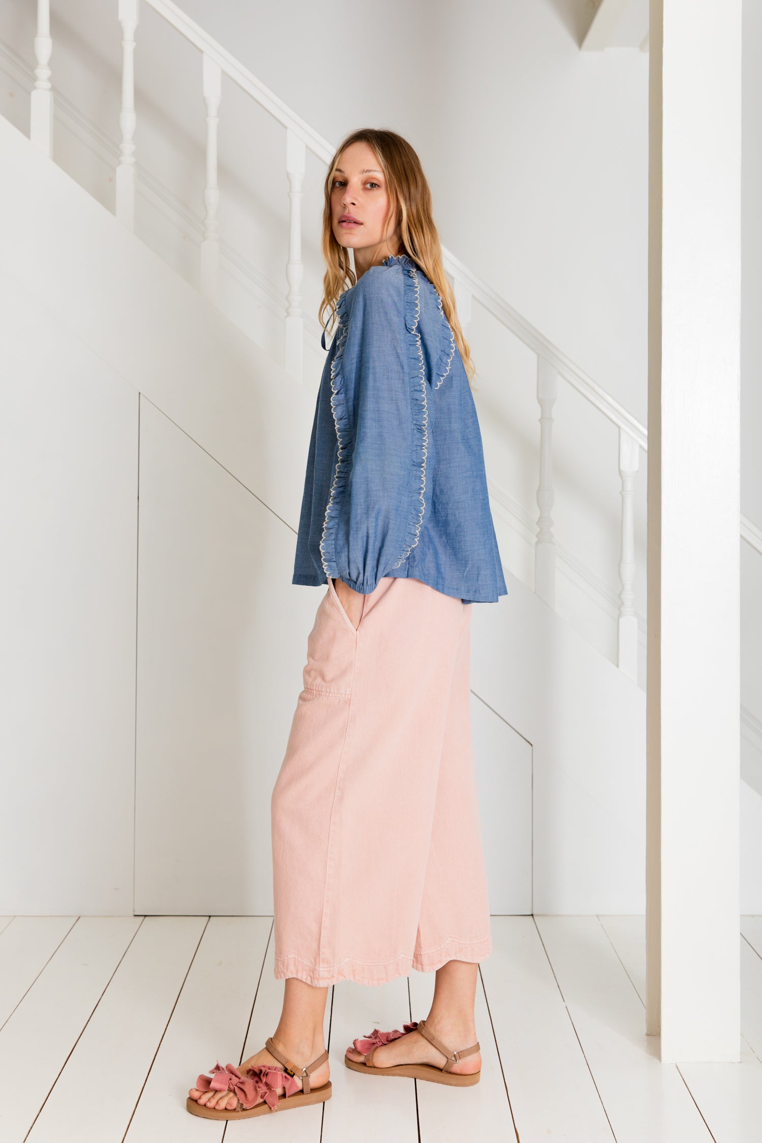 A relaxed + loose fitting blouse in organic cotton chambray, with contrast embroidered scalloped trims detail.