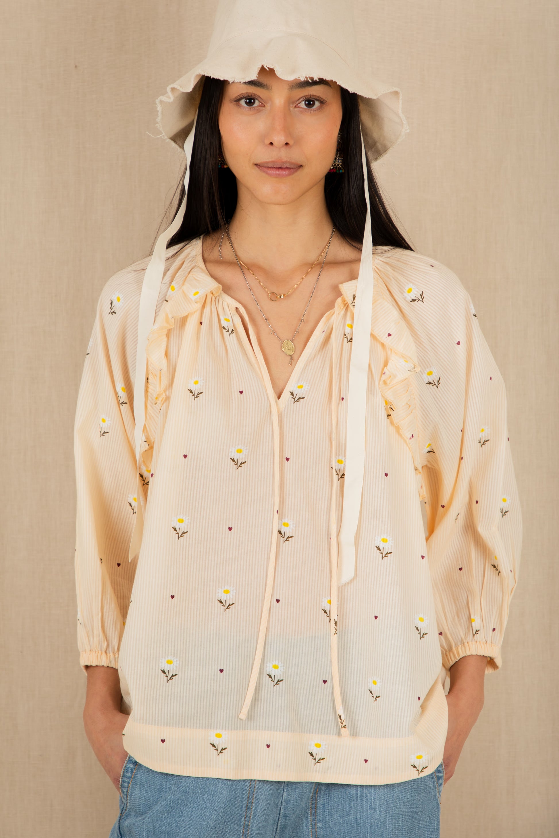An easy pop over top in a loose and relaxed fit, which is meant to skim the body with gentle volume, in a pretty printed self-stripe cotton.
