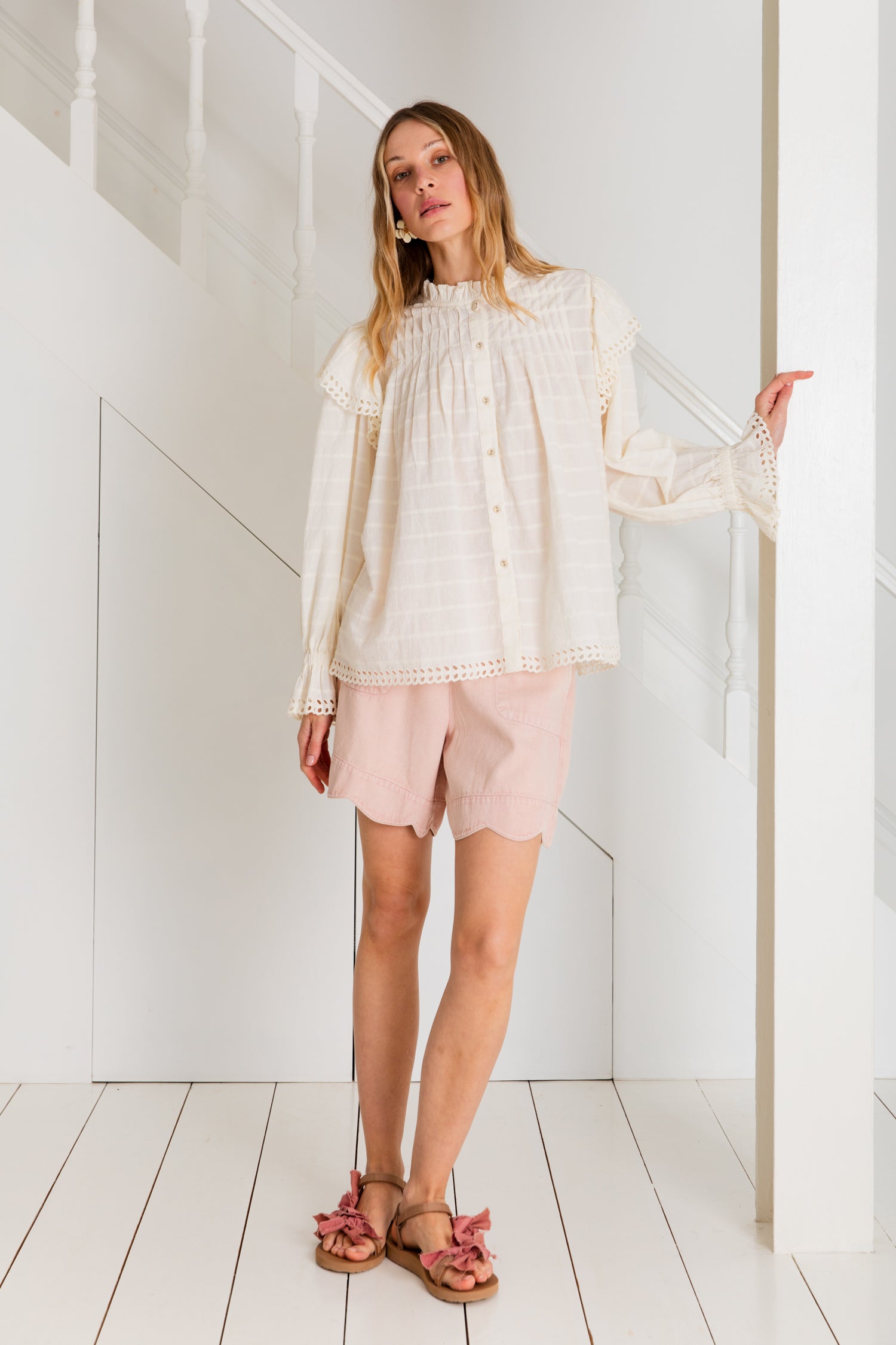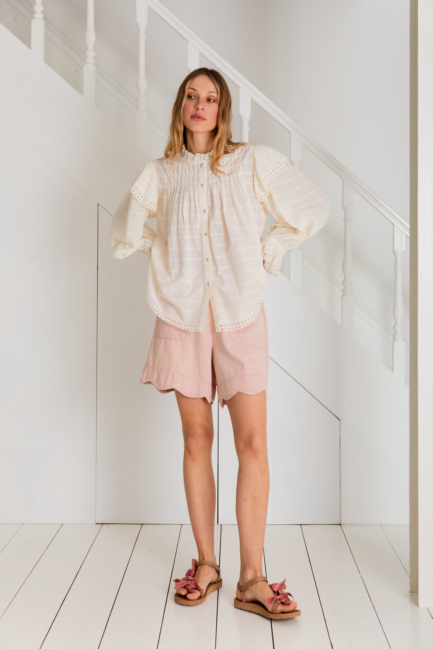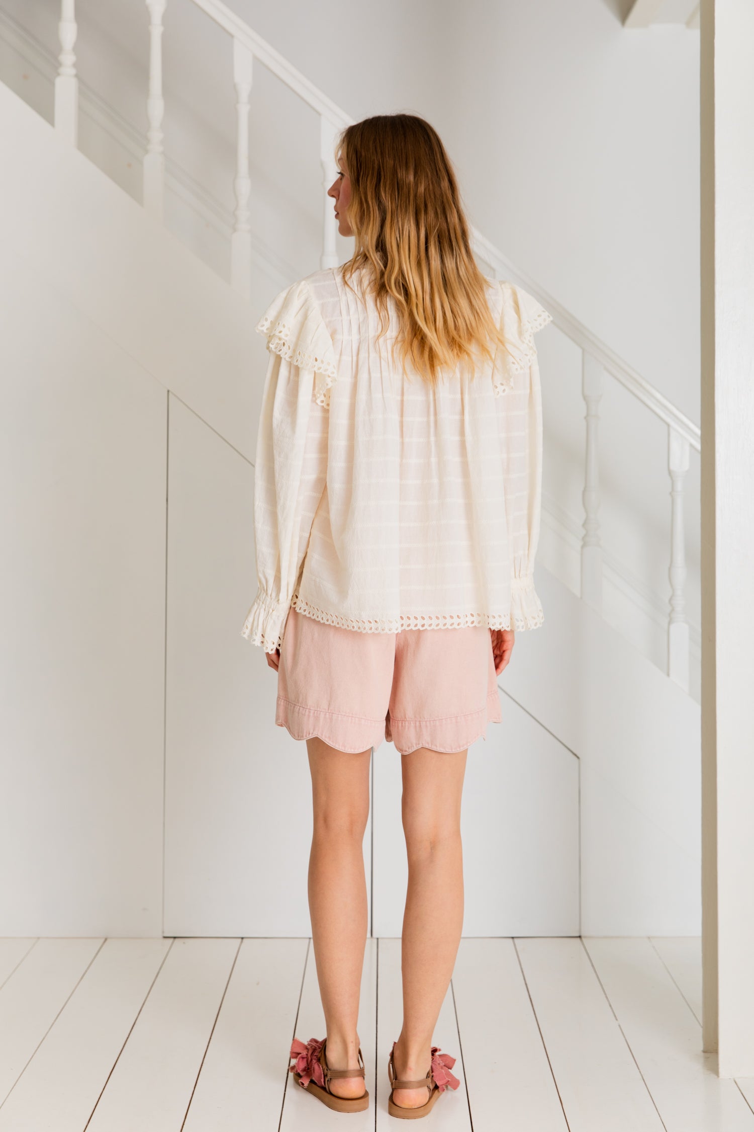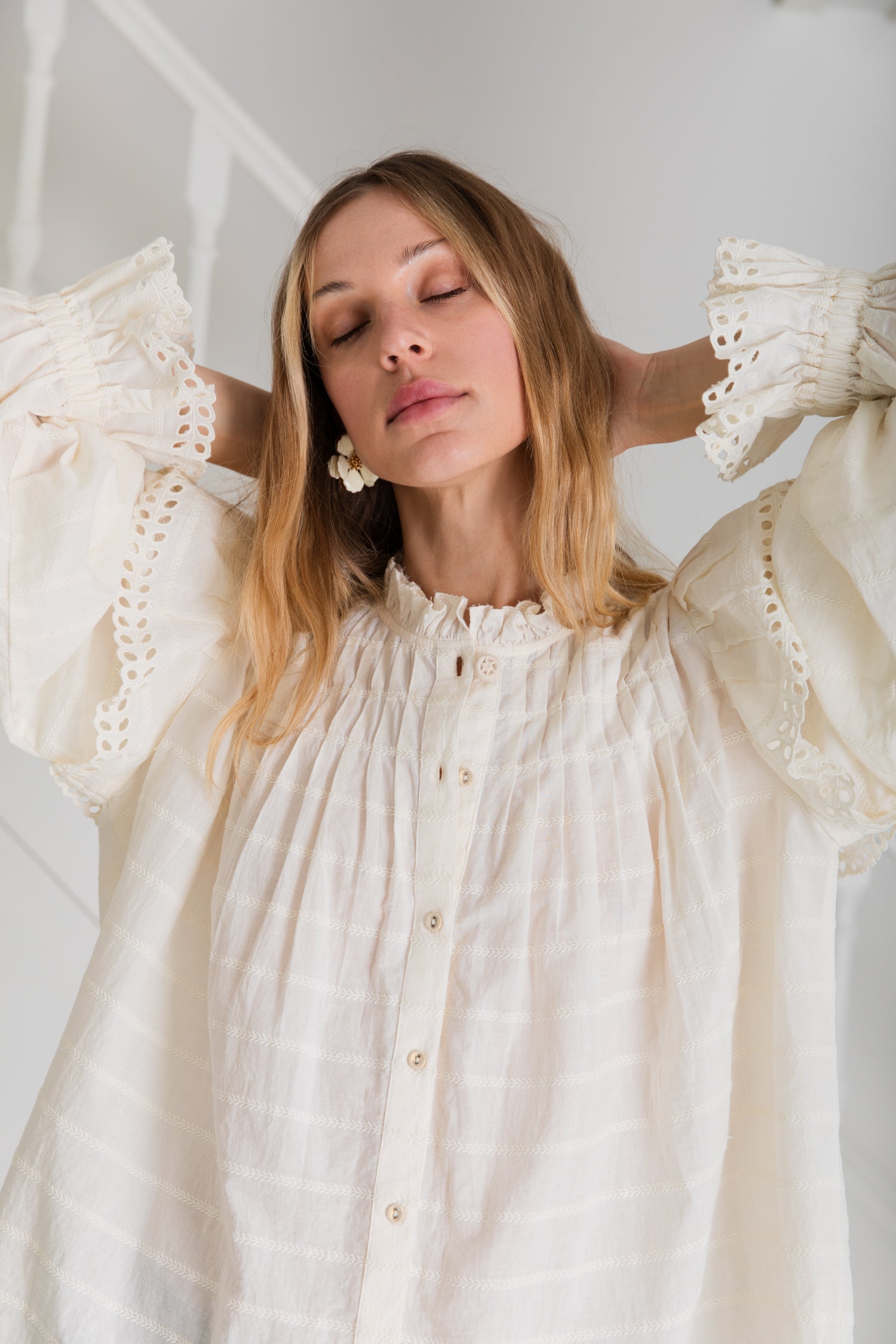 There is an embroidered eyelet trim detail along the hem, shoulder frill and cuff edges.