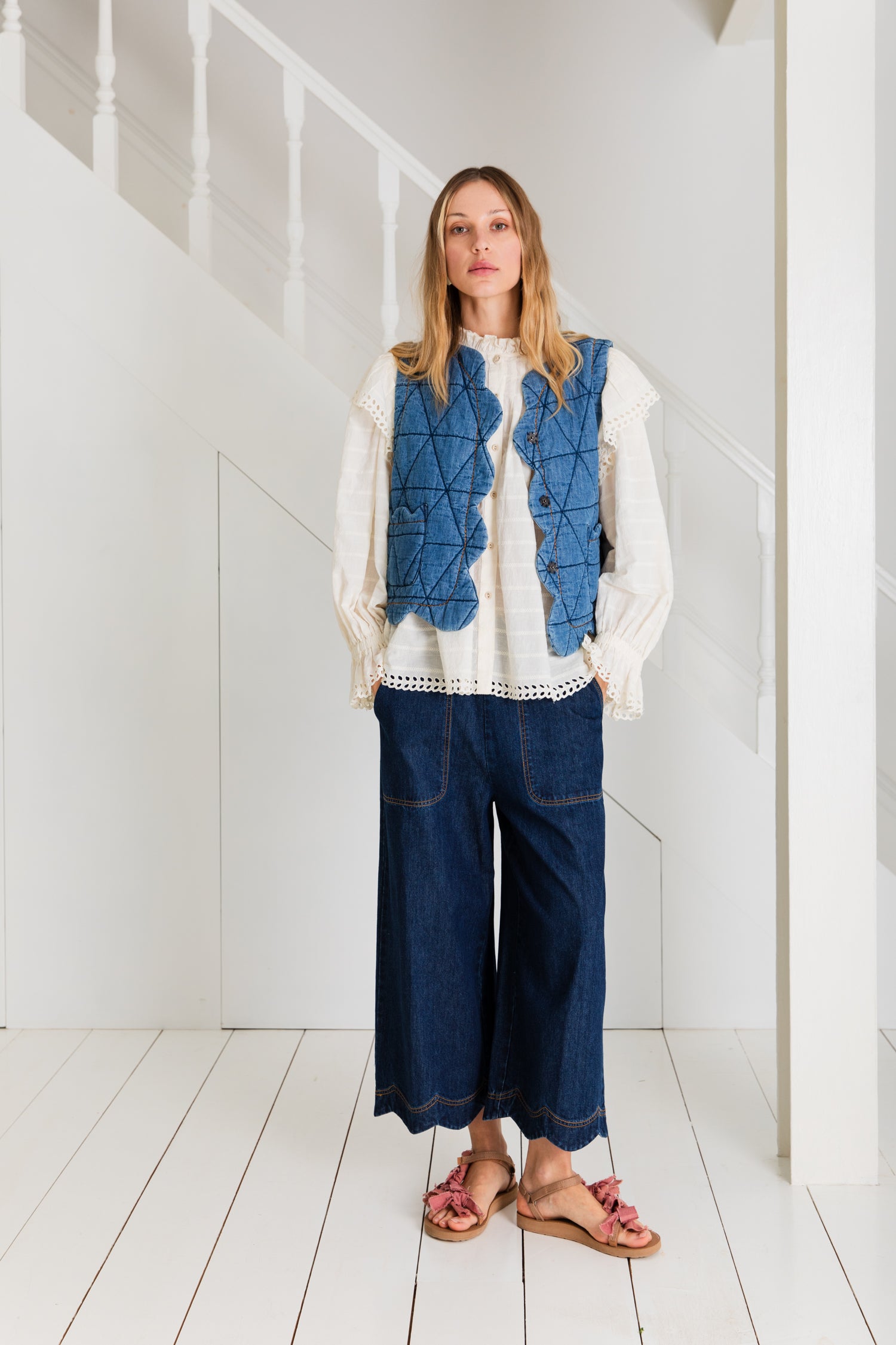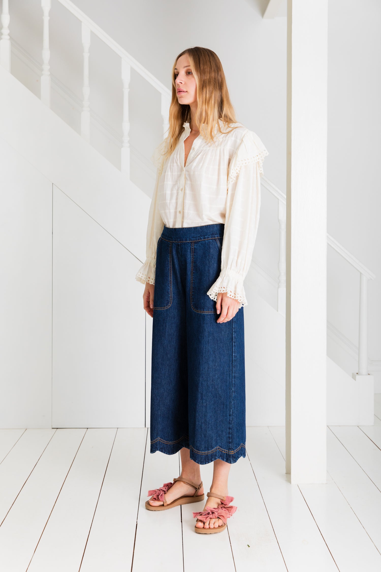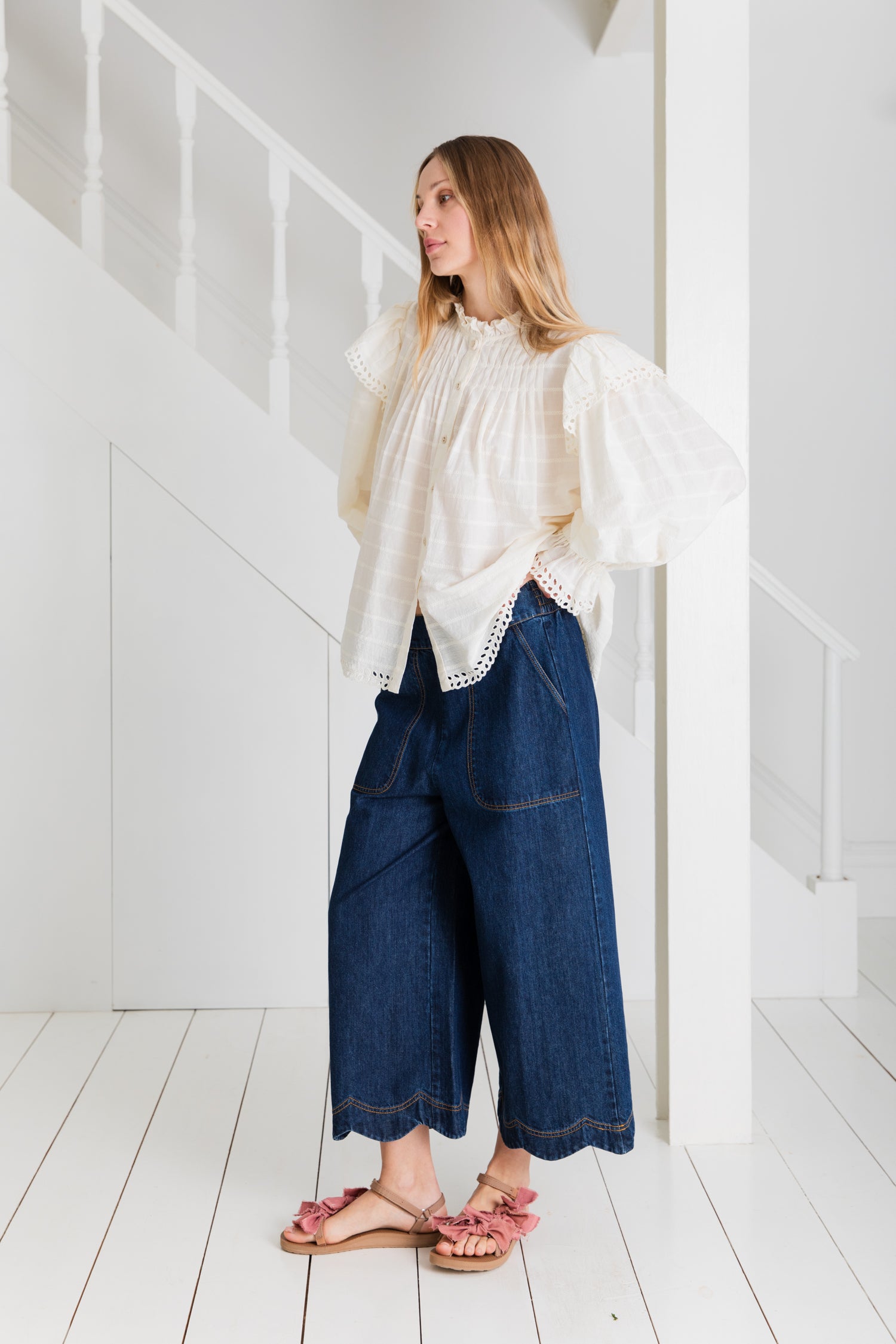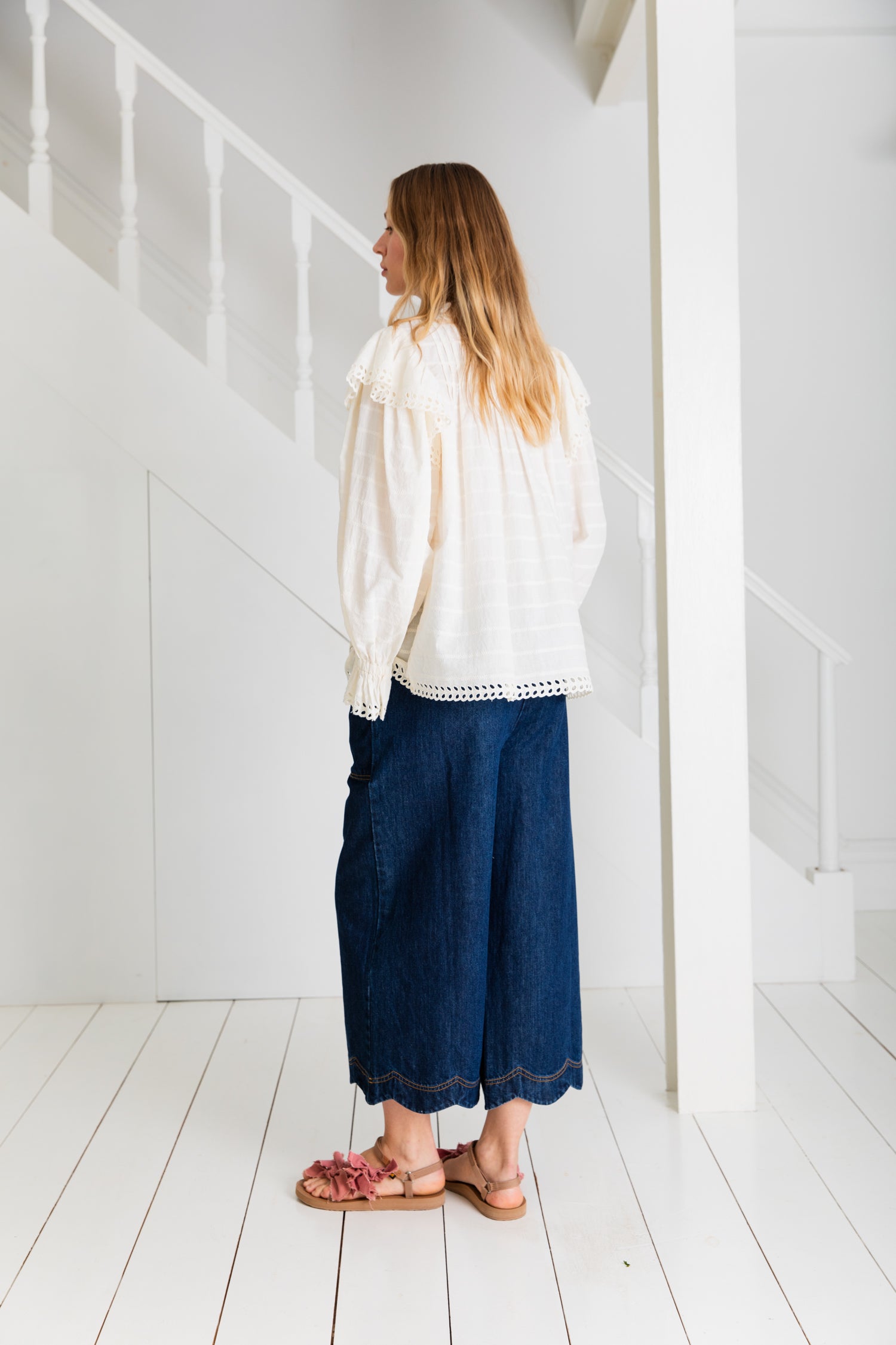 There is an embroidered eyelet trim detail along the hem, shoulder frill and cuff edges.