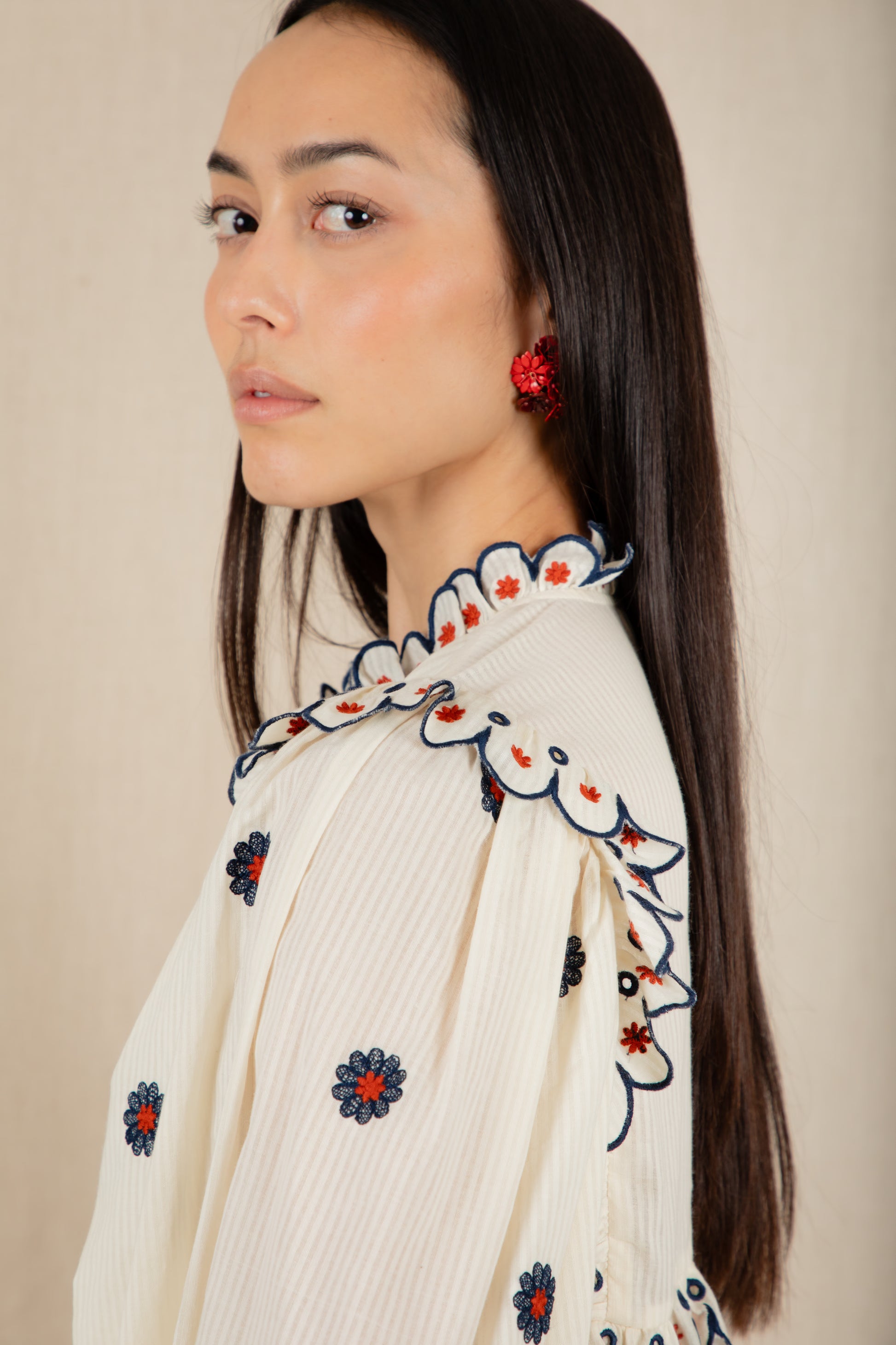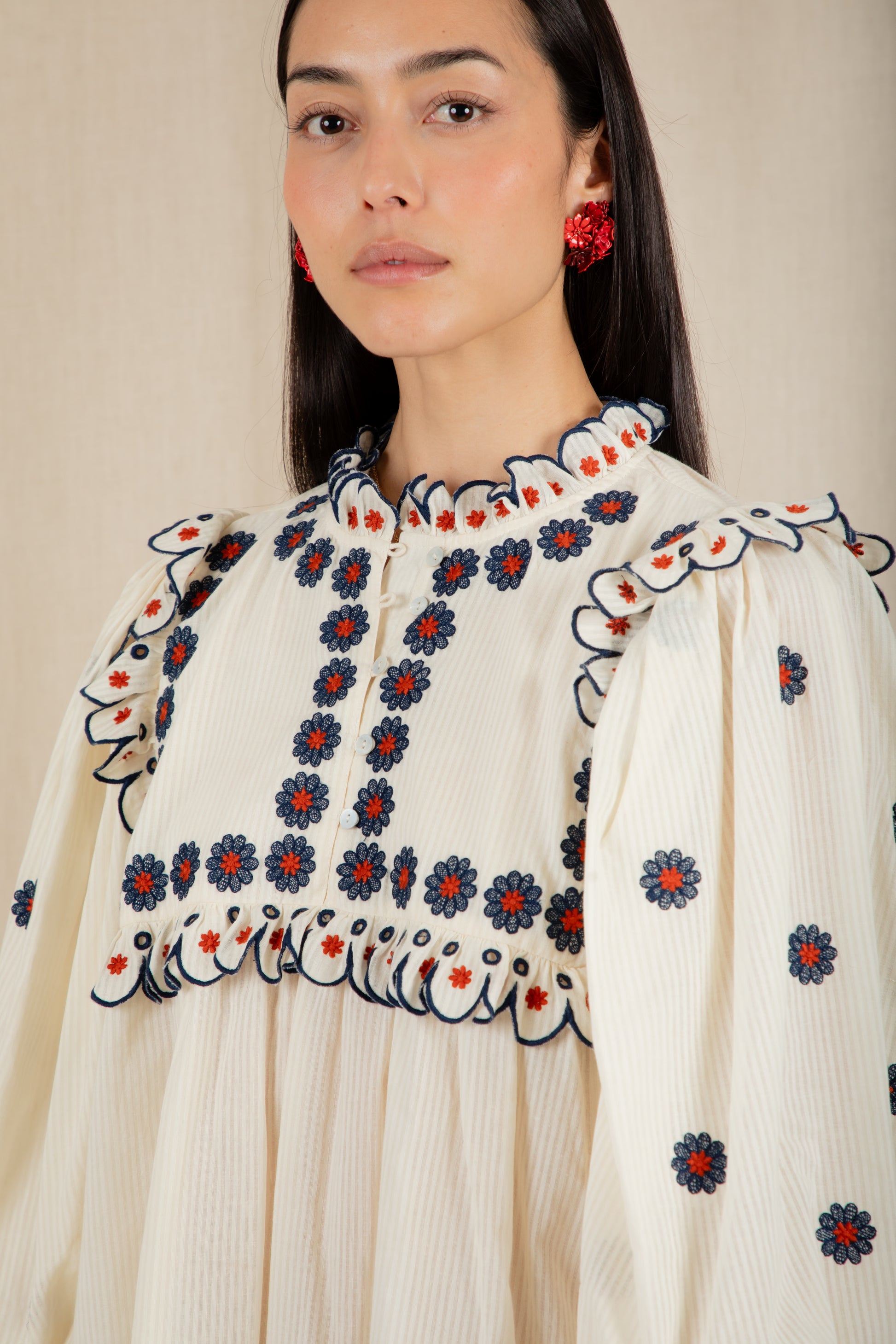 The sleeves and bodice have a contrast placement embroidery + a fine scallop and embroidered frill is inserted around the bib edge, which has a button and loop opening.