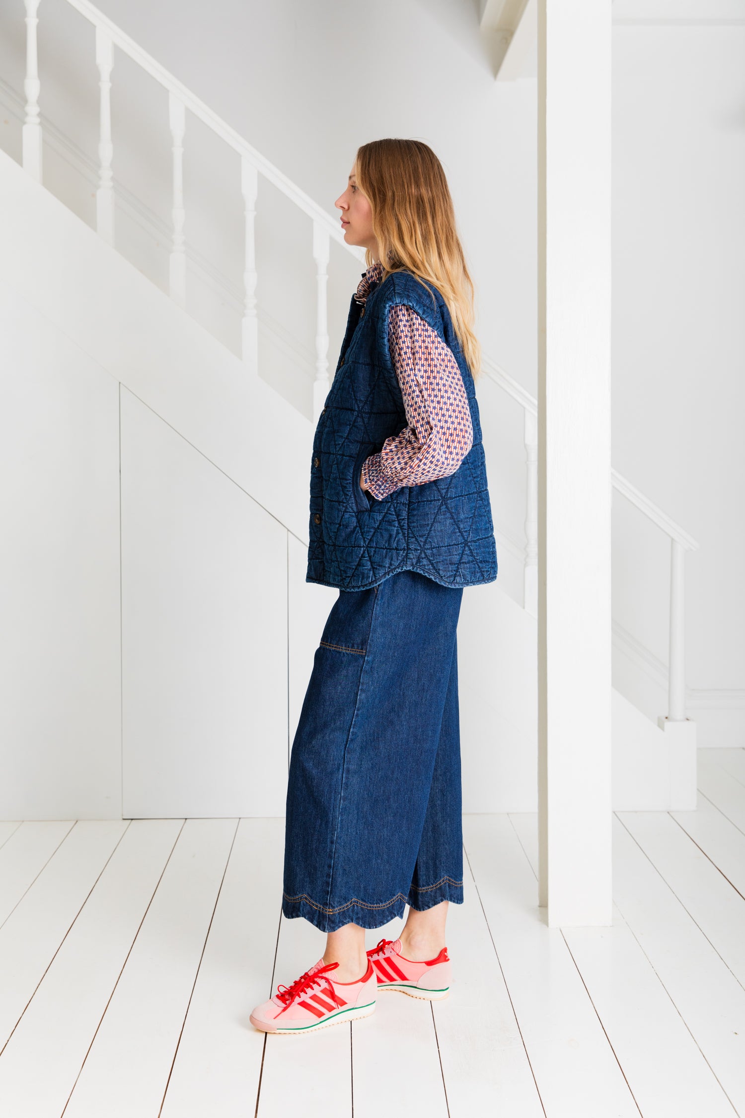 A longer line, quilted gilet with a grown on shoulder, in a mid-wash organic cotton denim.